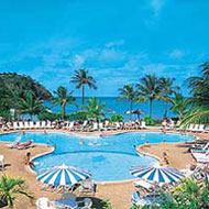 This sprawling resort is nestled amidst 65 lush, tropical landscaped acres. The grounds are divided into five themed villages, all centered around Seaside Cove, where fun-filled daily activities and exciting nightly entertainment take place. The main pool is superb, with a glistening waterfall, exciting waterslide and refreshing swim-up bar. Courtesy jitneys run through the resort. This beachfront hotel provides an active, informal vacation experience. 369 air-conditioned rooms and suites.
